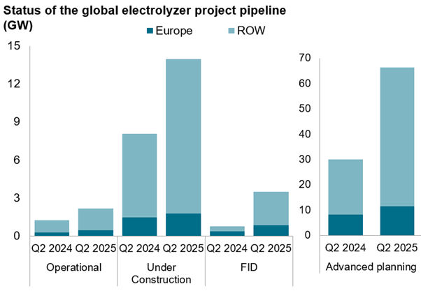 European clean hydrogen policy has been a key driver of market development globally, not only due to interest in developing local supply, but also in demand for facilities outside of Europe. Hydrogen market development has slowed recently, mostly due to a downshift in ambition in the face of high costs and insecure energy supply. European governments are still willing to commit public funding to support renewable hydrogen projects and innovation, but economic discipline and growing defence budgets are likely to apply pressure on the level of financial commitments.