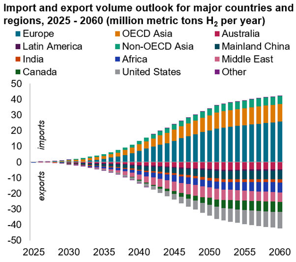 As interest in clean hydrogen increased in the early 2020s, countries with abundant renewable electricity resources announced long-term plans to use hydrogen to export this energy around the world. National hydrogen strategies from Chile, Brazil, Morocco, Egypt, Oman, India, Australia, Norway, Canada, and the US all included exports as a key demand market for domestic projects. Competition for the import markets in Europe, Japan, and Korea could become intense with so many regions vying for market access. Project selections from import-focused subsidy programs like H2Global and the Japanese government’s contract-for-difference scheme loom as major signposts in 2025. Who will win the race to supply clean hydrogen to the world, and what factors will be key in determining the market’s winners and losers?