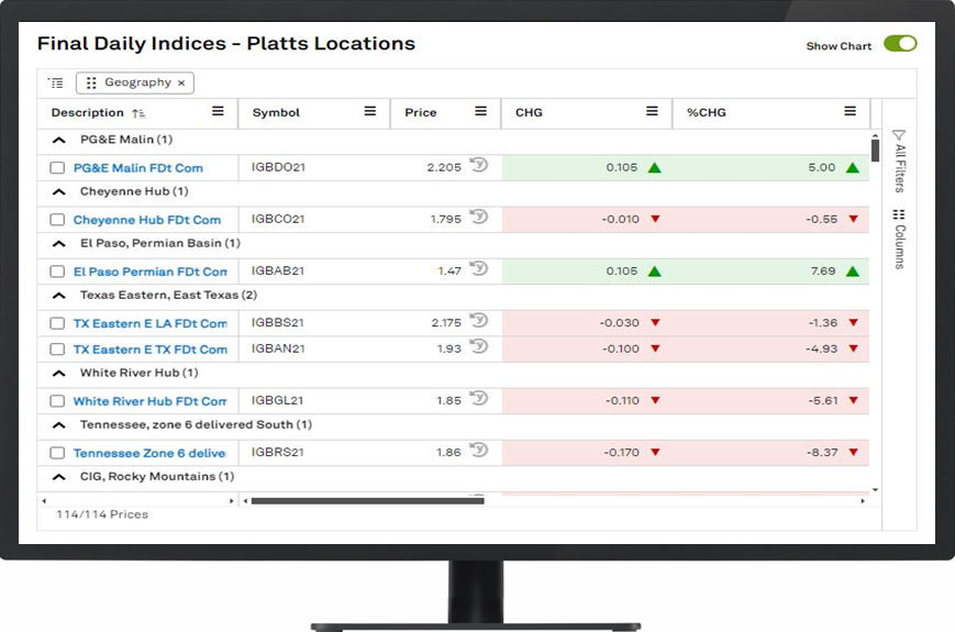 In today’s fast-paced energy landscape, where supply and demand shift rapidly, having actionable data is crucial. That's where Platts comes in. Our Americas Gas & Power Market Data service provides you with essential insights, including over 110 daily Platts US natural gas price benchmarks, 44 daily on-peak and off-peak North American power indexes, and 35+ global thermal coal assessments that enhance market transparency.