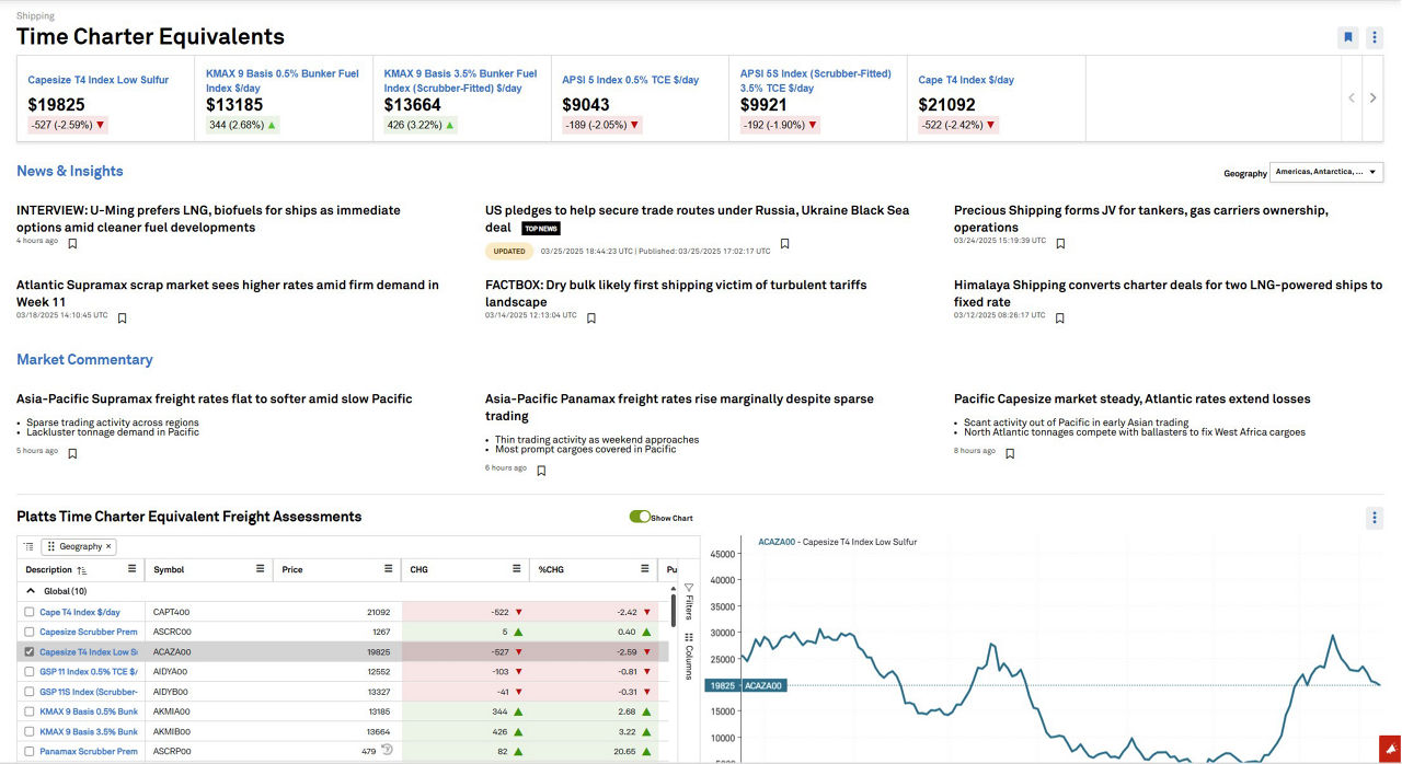 Seize the pulse of global commercial shipping with Platts price data for dry bulk markets. Our rigorous methodologies ensure accurate and reliable daily price assessments across a wide range of dry commodities. including metals, coal, power, and agriculture. From Platts Time Charter Equivalent to voyage charter assessments, our coverage spans the critical metrics you need.