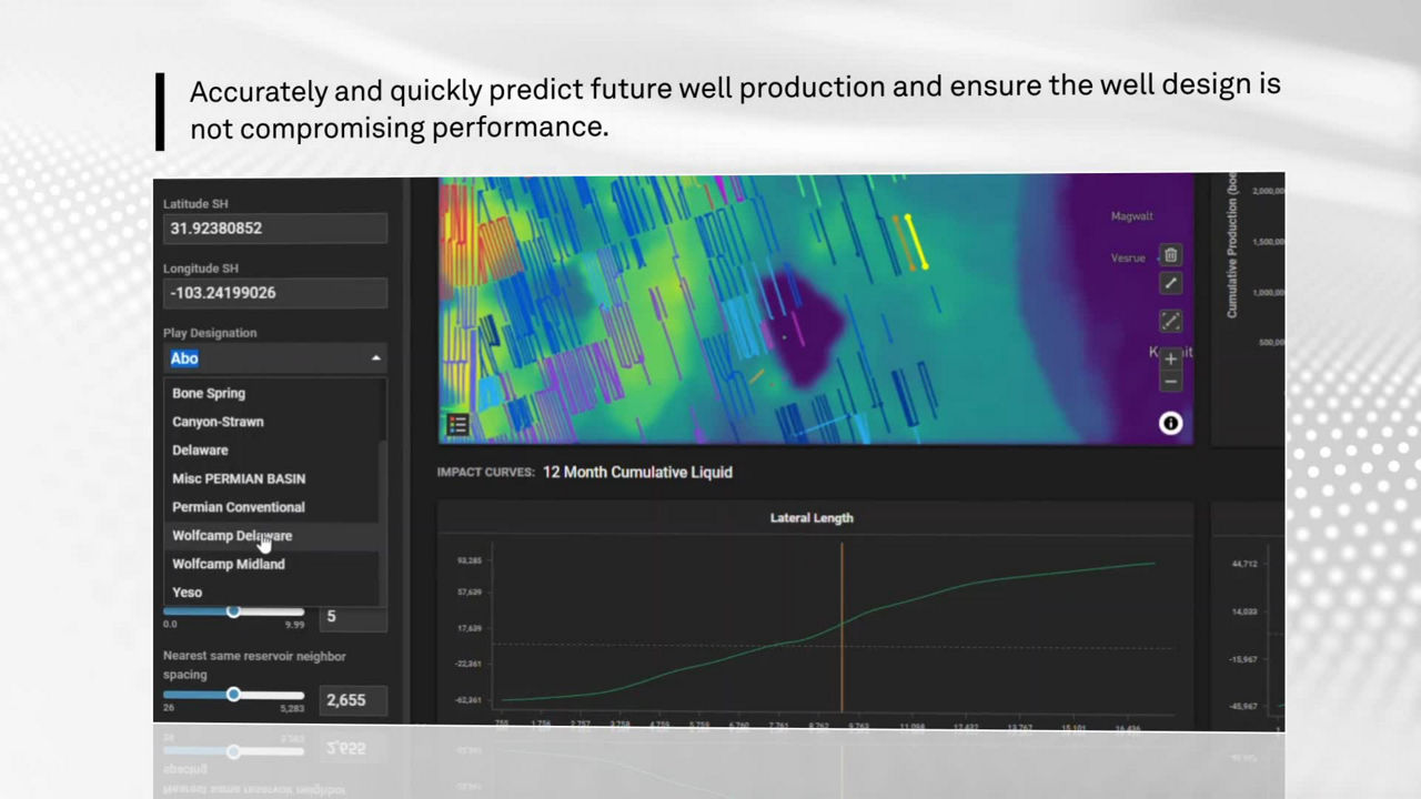 The energy analytics platform has type curves for every producing well in North America. We used proven screening technology from Harmony and artificial intelligence to partition wells and produce hyperbolic parameters that lead to accurate oil production forecasting. And you can test future production outcomes based on a variety of well designs and parameters.