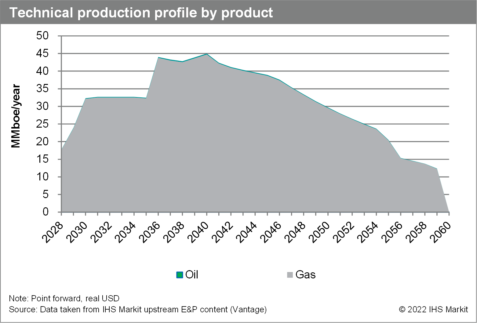 IHS Markit Vantage Latin America team has modelled the Gorgon asset considering two development phases for optimum recovery of 2P resources. Due to water depth and reservoir content, two spar buoy platforms are considered to be deployed, each possessing a topside module capable of processing 650 million cubic feet per day (MMcf/d) of gas, and 5,000 barrels per day (b/d) of oil. A start date in 2028 has been assumed for the project considering operator's view.