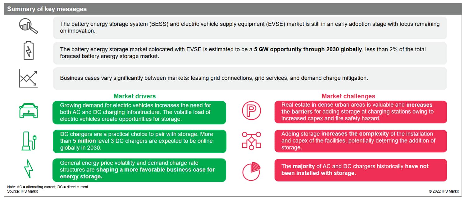 The 2022 electric vehicle supply equipment (EVSE) and energy storage report from IHS Markit provides a comprehensive overview of the emerging synergies between energy storage and electric vehicle (EV) charging infrastructure and how these differ by region and charger type. Key findings from the report: