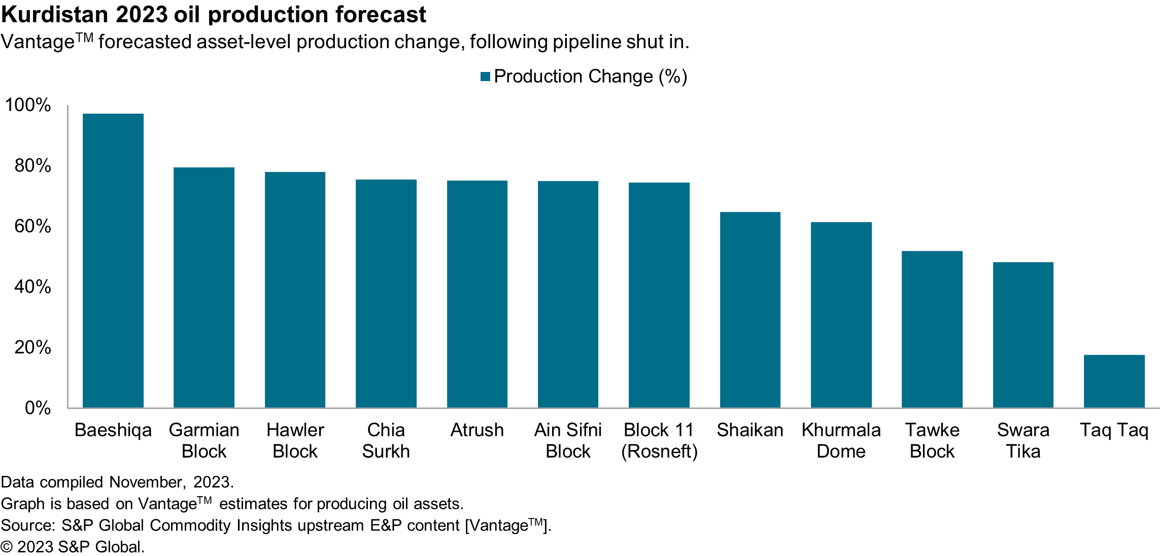 Energy has generated a forecast illustrating the percentage change for asset-level production in Kurdistan following the pipeline shutdown. The data reveals an average decrease of 61% across these assets. It is crucial to highlight that production activity remained largely unaffected during most of the first quarter, as the pipeline closure only took place on March 25, 2023. This underlines the closure's drastic and immediate impact on production.