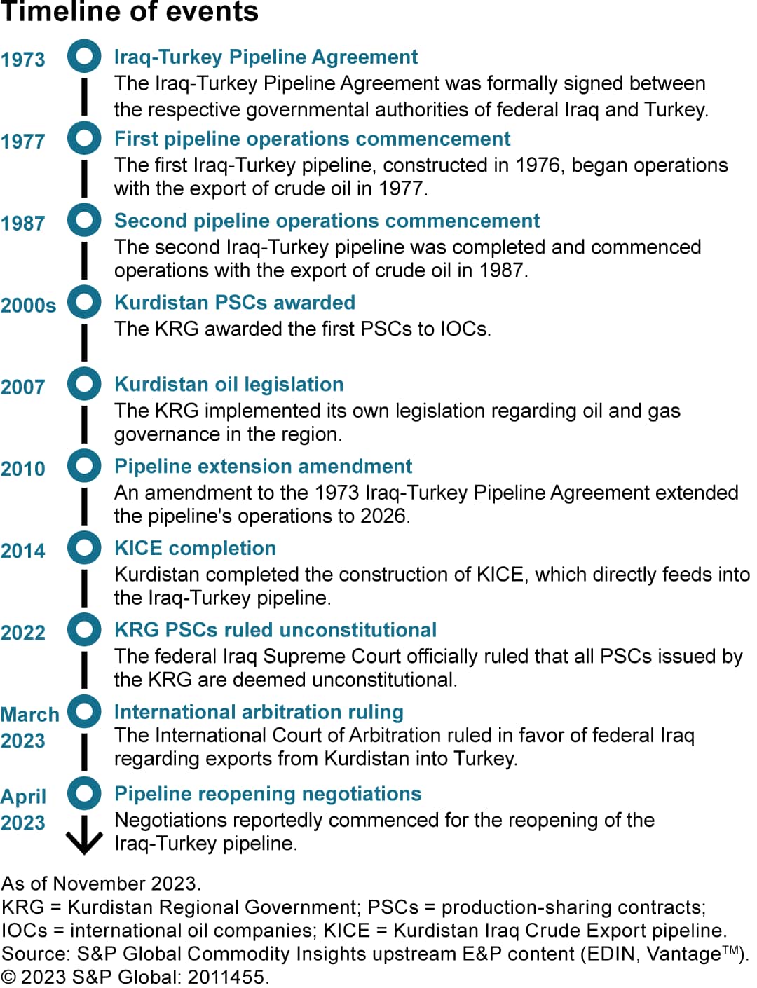In a landmark ruling on March 25, 2023, the International Court of Arbitration judged Turkey to have breached the pipeline transit agreement it had entered with Federal Iraq in 1973. The historic verdict addresses the longstanding dispute of the semi-autonomous Kurdistan Regional Government (KRG) independently exporting over 400,000 barrels per day (b/d) of crude through the Iraq-Turkey Pipeline (ITP) to the port of Ceyhan in Turkey.