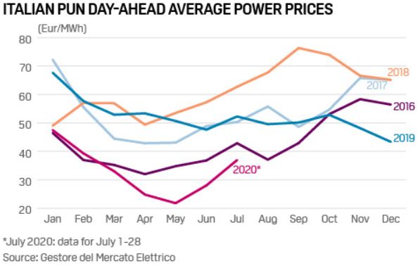 What’s happening? Power demand has recovered from lockdown lows in Southern Europe, but remains below norms in Germany and the UK. Spot prices reflect the recovery, with Italy’s national day-ahead power price, known as the PUN, averaging over Eur37.30/MWh in July, the highest monthly average since February according to market operator GME. The price jumped as high as Eur51.73/MWh July 28 and Eur49.05/MWh July 29 on a combination of higher temperatures and lower renewable energy generation.