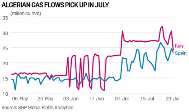 What’s next? S&P Global Platts Analytics expects Spanish imports from Algeria to start picking up this quarter to average around 24 million cu m/d, and to increase further in the fourth quarter. Trading sources expect Algerian gas to play the leading role in Spain’s supply. Italian imports from Algeria are due to rise further and average about 27 million cu/d over the next two months in order to meet the contractual take-or-pay levels for this Gas Year of about 9.7 Bcm/year.