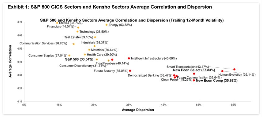 The results are even more striking in Exhibit 2, where we compare the S&P 500 GICS sectors to the Kensho subsectors, which have higher dispersion levels along with extremely low correlations.