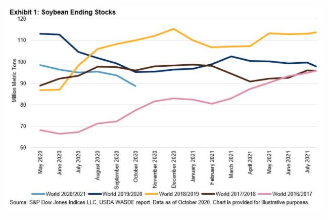Only a few months ago, it seemed that global soybean supplies were more than ample, and in the case of the U.S., a semi-permanent soybean mountain had been built in the wake of damaged demand from its top customer, China. Fast forward to late October 2020, and the S&P GSCI Soybeans is up 29% since the low in March of this year, making a new high last week driven by abrupt supply cuts and the rapid return of export demand. Earlier this month, the USDA’s monthly World Agricultural Supply and Demand Estimates (WASDE) report forecast a large, and somewhat unexpected, reduction in global soybean stocks. Exhibit 1 illustrates global soybean ending stocks in the 2020-2021 crop year dropping in October 2020 to the lowest level in four years.