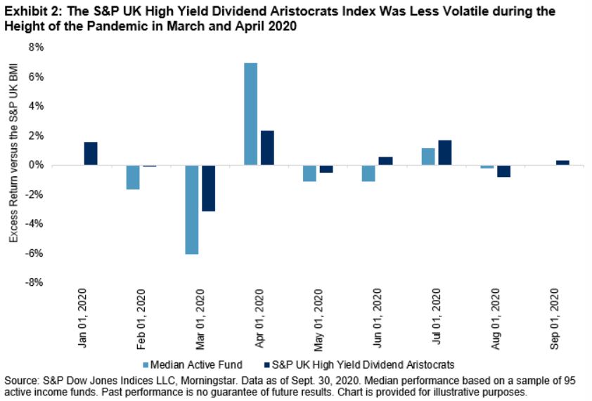 A potential consequence of commonality of dividend portfolios is convergence in performance. Although inconclusive, the performance difference between the median active fund and its passive counterpart, the S&P UK High Yield Dividend Aristocrats Index, has converged to a tighter range in recent months, as shown in Exhibit 2. It is also worth highlighting that the index posted meaningful outperformance of 2.6% YTD as of Sept. 30, 2020.