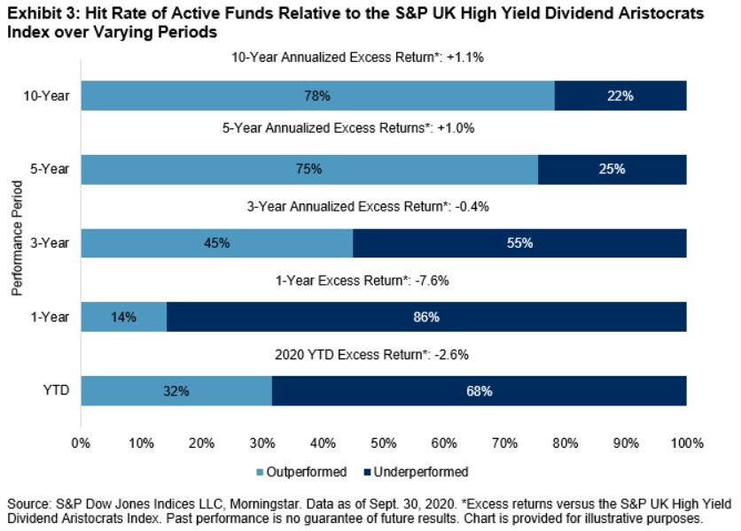Historically, active manager selection has indeed shown to add value. Exhibit 3 shows that at least 75% of active funds were able to outperform the S&P UK High Yield Dividend Aristocrats Index over the 5- and 10-year periods ending Sept. 30, 2020. However, the tide shifted in recent years, when only 14% of funds outperformed over the past year. Going forward, outperformance may prove to be a greater challenge for the aforementioned reasons.