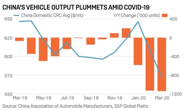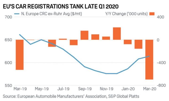 Global demand could fall by 50% or more against 2020 amid market concerns of prolonged lockdowns or a resurgence of the coronavirus. Steel companies in Europe and the US have been slashing production due to the downturn in car making.