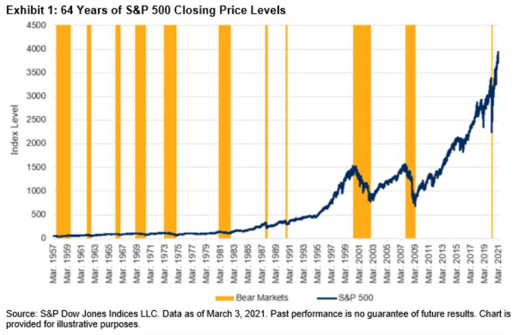 Exhibit 1 shows the S&P 500’s closing price levels over its live history. Eleven bear markets captured periods of pessimism, while the intervening recoveries reflected improved outlooks. Overall, the index posted an annualized price return of around 7.2% over the last 64 years.