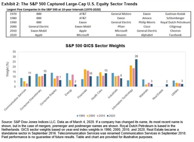 The S&P 500 represents the large-cap segment of the U.S. equity market. The index is float-market-cap weighted, which means that index weights reflect aggregate investor expectations. Exhibit 2 shows how the evolution of the largest five companies in the S&P 500 and its GICS® sector weights captured the increased importance of Information Technology companies, and the reduction in Industrials and Energy companies.