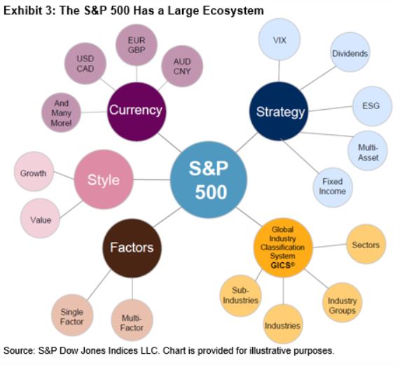 A sizeable ecosystem has grown up around the S&P 500. Exhibit 3 shows a range of indices based on the S&P 500. This is important because the liquidity associated with products tracking these indices can help foster transparency, market efficiency, and investor confidence.