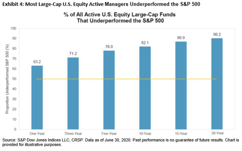 Over its history, it’s proven to be very difficult for active managers to beat the S&P 500. Our U.S. SPIVA Scorecards show that most U.S. large-cap active managers underperformed the S&P 500 in 16 of 19 calendar years between 2001 and 2019. And as of the end of June 2020, the majority of all large-cap U.S. equity managers underperformed the S&P 500 across all time horizons shown.
