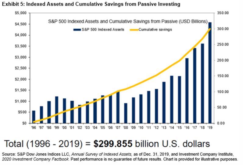 Although such underperformance is not specific to the U.S., and there are various explanations as to why beating benchmarks is difficult, increased awareness of the potential benefits of adopting an indexed-based approach has arguably had a bigger impact in U.S. large caps than in most other areas. Exhibit 4 shows that assets directly tracking the S&P 500 have grown substantially since 1996, reaching USD 4.59 trillion at the end of 2019. Multiplying the assets tracking the S&P 500 at the end of the year by the corresponding difference in average expense ratio between active funds and their passive alternatives shows that the estimated cumulative savings to investors from passively tracking the S&P 500 was USD 300 billion between 1996 and 2019.