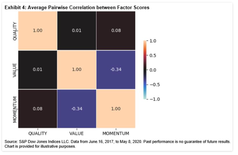 Exhibit 3 shows that the S&P 500 QVM Multi-Factor Index tends to have a higher overlap with the quality factor (which has outperformed recently [4]), and a lower overlap with the value and momentum indices. This is partly due to a negative correlation between momentum and value exposures among S&P 500 constituents (see Exhibit 4), which implies that high-quality stocks have a better chance of being selected when constituents are sorted on an average of all three factor scores.