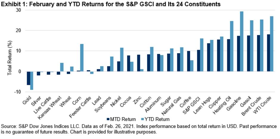 An inflationary tide lifted almost all commodity boats in February 2021. Most constituents of the S&P GSCI rose while gold, the commodity that market participants often look to for inflation protection, lagged. The S&P GSCI rose 10.6% overall in February, with copper and energy doing most of the heavy lifting.