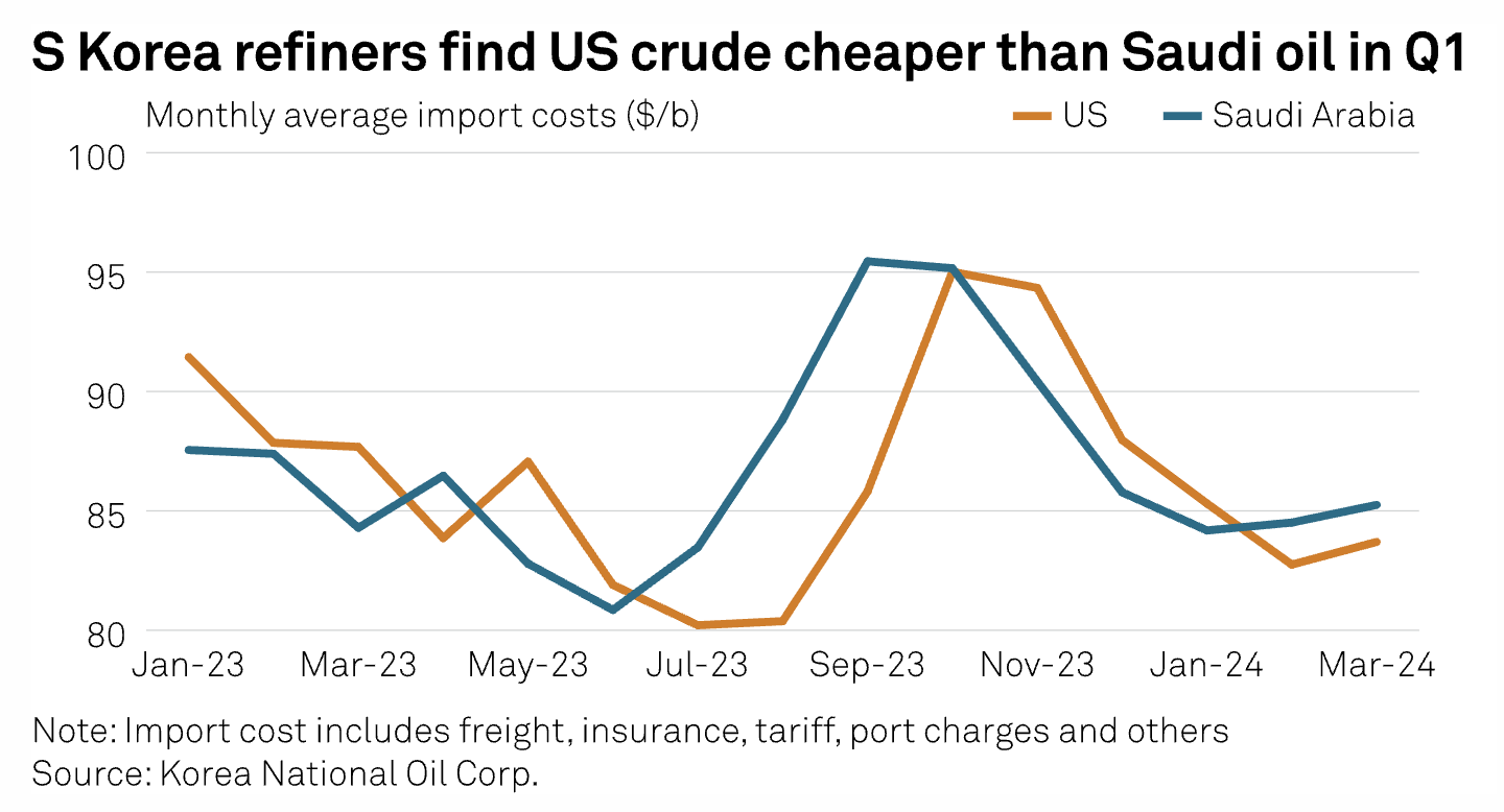 South Korea reduced imports of Saudi Arabian crude and boosted shipments of US cargoes for the second straight month in March because of more attractive feedstock trading economics for American barrels, as Persian Gulf-Asia tanker insurance costs rose in the wake of geopolitical tensions in the Middle East, industry sources said over April 24-26.