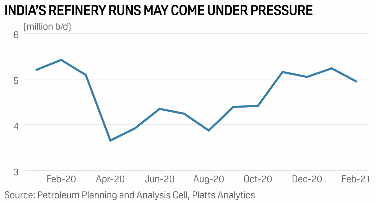Indian refiners are starting to slow their crude runs, as high retail prices have dented domestic appetite for oil products -- a trend that could get prolonged if the resurgence of COVID-19 in some provinces leads to another round of lockdowns and movement restrictions, analysts told S&P Global Platts.