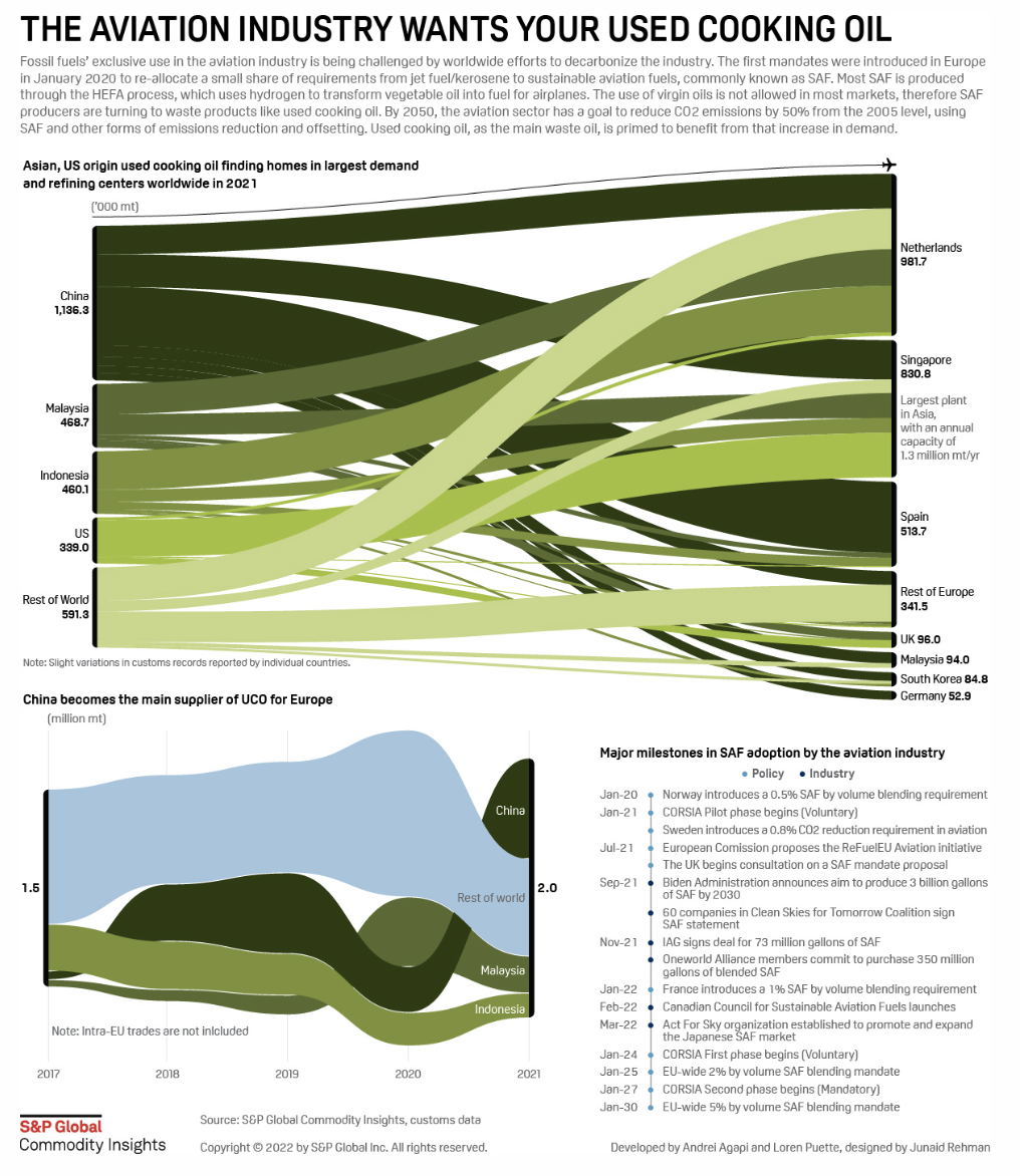 With temperatures rising across the globe, the search for alternative fuel to reduce carbon emissions is getting more imperative. Sustainable aviation fuel and marine biofuels, which both count used cooking oil as one of their feedstocks, are among the available alternatives as a drop-in fuel utilizing existing technologies and infrastructure.