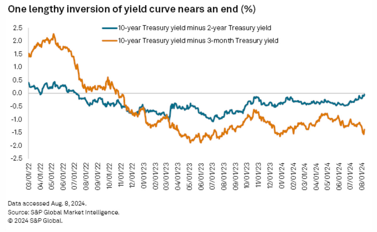 A key portion of the Treasury yield curve has largely returned to flat, more than two years after it inverted and triggered a blaring recession signal. The spread between the 10-year and 2-year Treasury bond yields, which has been negative since July 2022, briefly reached zero earlier this month after a weaker-than-expected jobs report boosted the expectations for multiple Fed rate cuts before the end of 2024. The spread settled at negative 5 basis points Aug. 8.