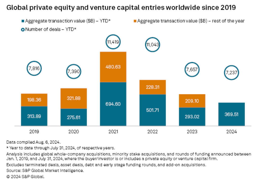 Global private equity and venture capital deal value is on the rise this year, even in the face of investor concerns about interest rates and a possible US recession. In the year to July 31, global deal value amounted to $369.51 billion, a 26% increase from the same period in 2023, according to S&P Global Market Intelligence data. The number of deals during the measured period were down to 7,237 from the 7,657 reported a year earlier.