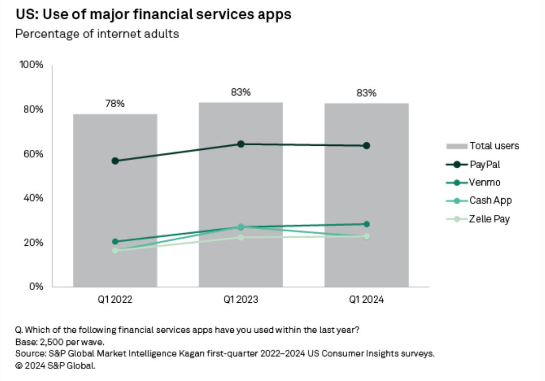 Eight in 10 Americans have embraced the digital economy by using financial apps for everything from online purchases and digital payments to mobile banking and more, according to S&P Global Market Intelligence Kagan's recent survey. Of particular note is the strong competition for all that consumer spending. In the latest 2024 US Consumer Insights survey, overall use of financial apps was flat year over year at 83%. Two-thirds of Americans use PayPal, the dominant financial app in the market.