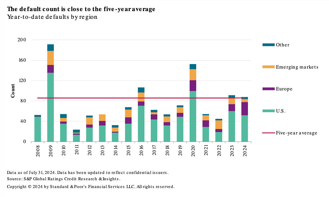Nine companies defaulted in July, the same number as in June and compared with seven in July 2023. However, the global year-to-date corporate default tally is still elevated at 87, which is just above the five-year average of 86 and only slightly below the 2023 year-to-date count of 91.