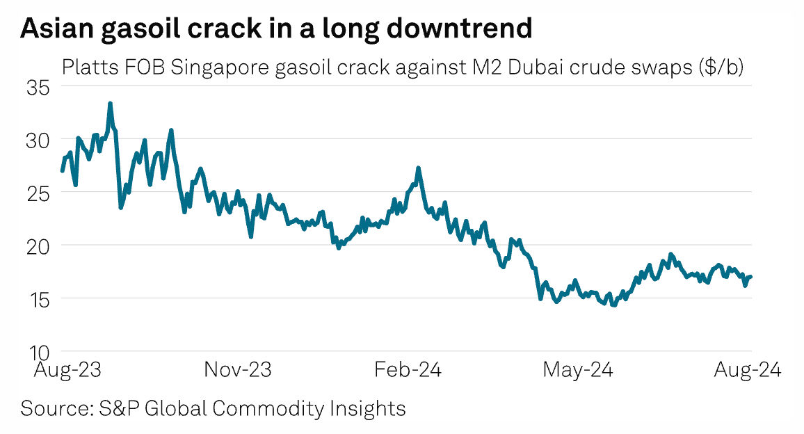 South Korean refiners are generally content with a slight improvement in refining margin so far in the third quarter but China's ample clean oil product export quotas and tepid regional economic activity pose a serious threat to the overall cracks and export margins, industry sources said Aug. 13-16. Asia-wide refiners hardly faced any crude supply security or feedstock procurement issues despite the prolonged OPEC+ production cuts and geopolitical tensions in the Middle East.