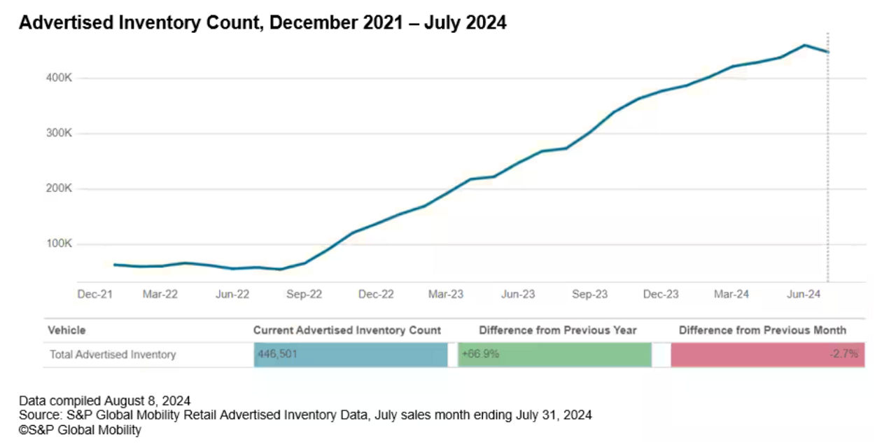Retail advertised vehicle inventory in the United States declined last month for the first time since May 2023. Available new inventory closed July at 2.788 million vehicles, up 52.5% vs. last July, but down 2.3% from June 2024. The 2.3% decrease is the largest percentage decrease seen within the full time period of S&P Global Mobility data, going back to January 2022 and is the first decrease since May of last year.