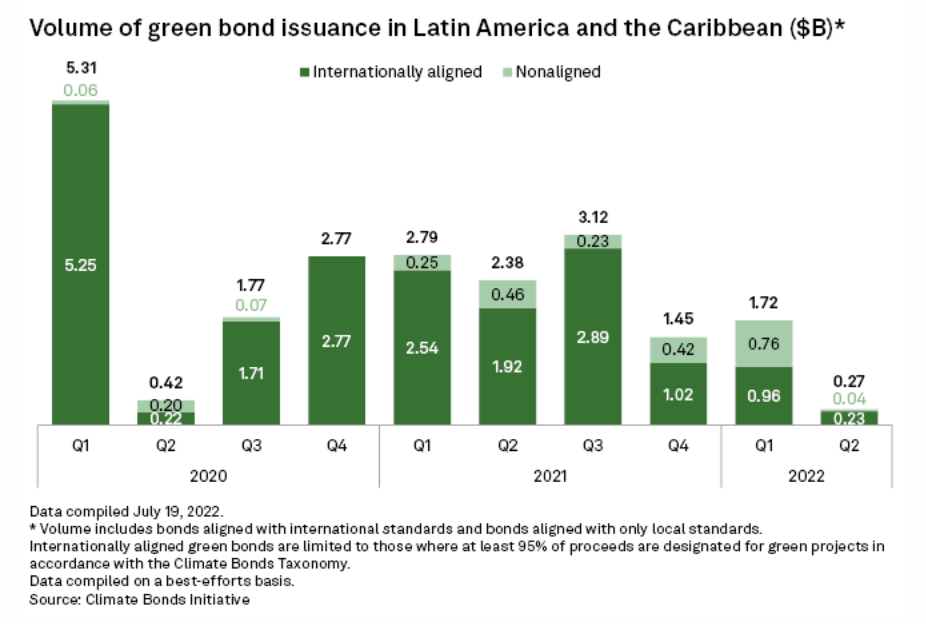 Pure green bond issuance in Latin America plummeted to a three-year low in the second quarter due to greater risk aversion on global markets and a preference for other sustainable bonds by local players. Environmental-focused debt operations during the period fell 88.7% year on year to $270 million according to the Climate Bonds Initiative, a U.K.-based company that tracks green debt globally. The total was also considerably below the $1.72 billion in funding secured in the previous quarter.