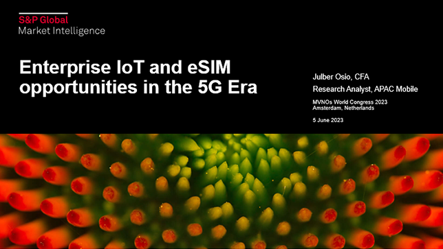 Maturing telecommunications infrastructure in developed markets stands to expand the role of telco operators to service enablers as well as providers. At the recent MVNOs World Congress 2023, S&P Global highlighted key opportunities for telcos to leverage 5G and embedded SIM (eSIM) technologies to power the growing universe of the internet of things (IoT). The S&P Global presentation, which included data and insights from Kagan and 451 Research, focused on three key trends for the industry: opportunities for mobile network operators (MNOs) as specialized companies, industry attitudes toward enterprise IoT deployments and the role of eSIM in enterprise deployments.