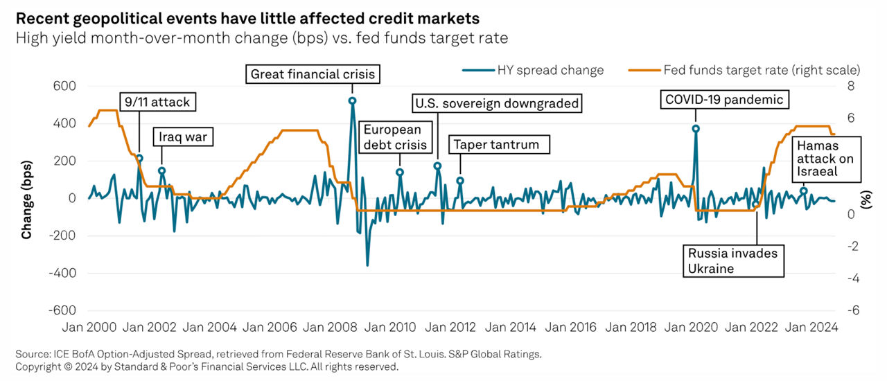 Any slowing of the current policy easing from the Fed would impact borrowing costs, and that would be felt mostly at the speculative end of the ratings scale, according to S&P Global Ratings. Investors would demand a higher risk premium, and borrowers would face more challenges servicing debt or refinancing.