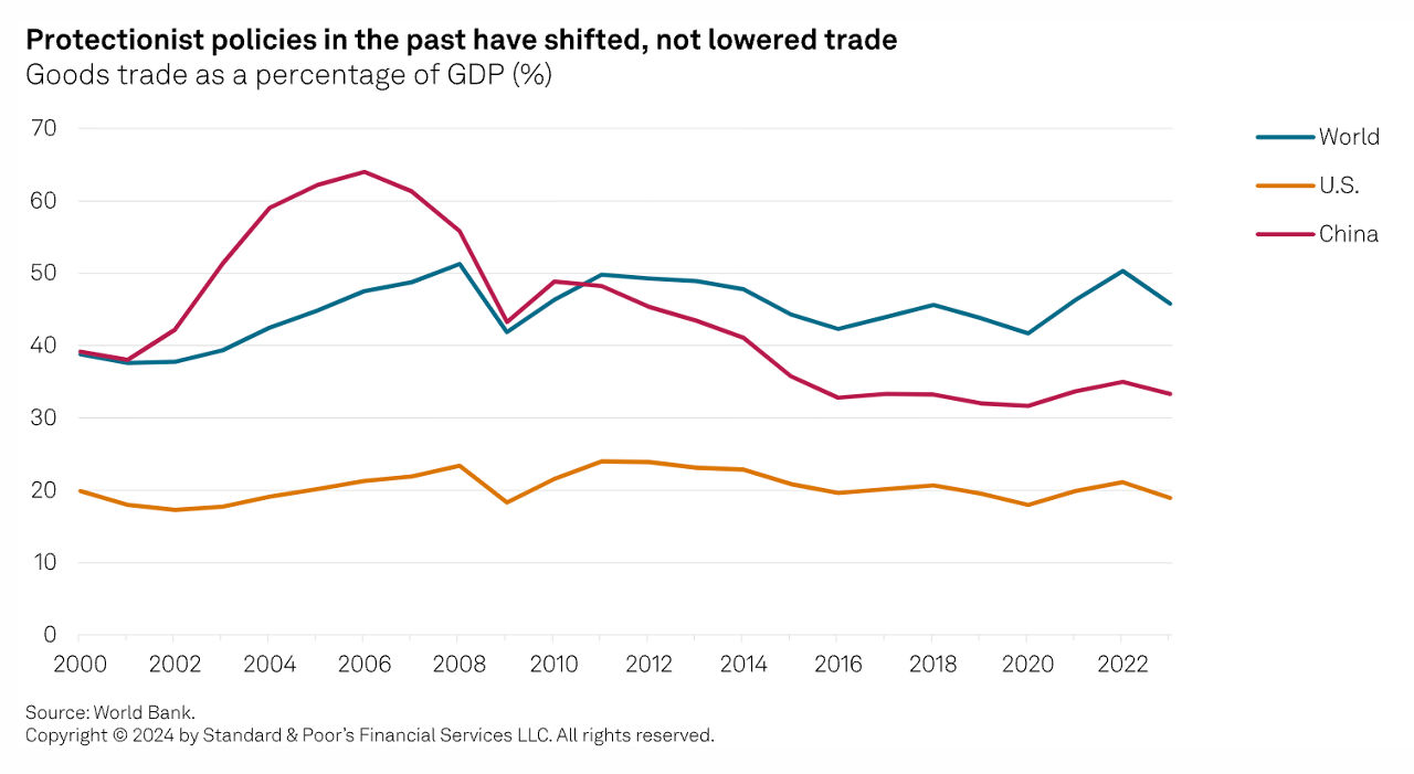 Trade protectionism has been rising globally in recent years, as is the risk for more, rather than fewer, of these policies in 2025. Tighter restrictions on global trade often have a negative impact on real GDP growth and could weaken financial conditions if they materially increase inflation and, consequently, interest rates.