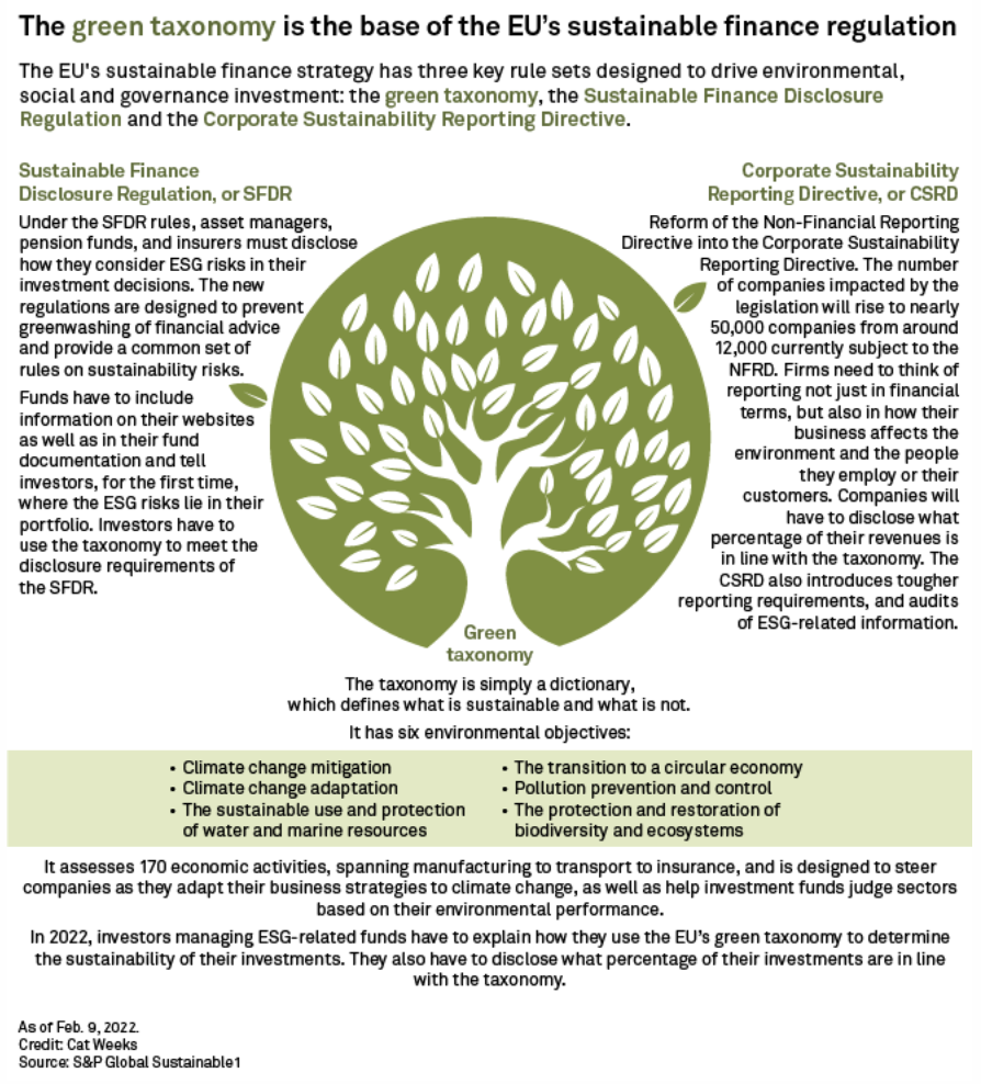 The EU taxonomy is a key component of the EU’s sustainable finance agenda and has become something of a buzzword in the world of ESG investing as one of the leading attempts to define green investments consistently and comprehensively. The EU aims to mobilize some €1 trillion in public and private investment over 10 years as part of its “Green Deal” to help it achieve its ambitious climate targets. And there are an estimated €3.3 trillion in ESG assets under management in the EU — so changes to the framework could sway investment decisions for large fund managers and their customers.