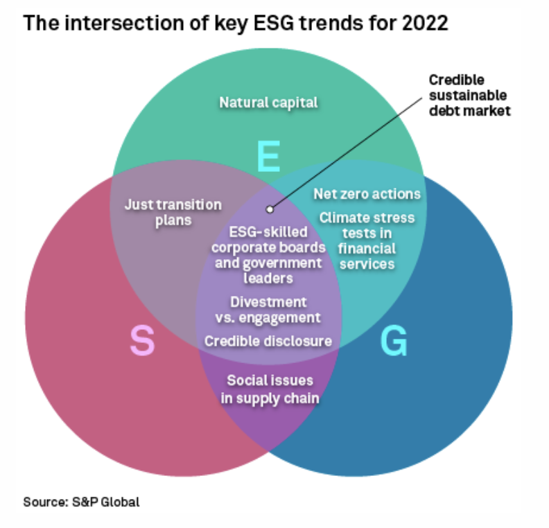 These are the “key ESG trends that we think will drive the conversation in 2022. Critically, these trends exhibit overlaps and interactions that will have a direct influence on the prospects for meaningful progress on ESG issues in 2022,” S&P Global Sustainable1 President Richard Mattison and S&P Global Ratings Global Head of Sustainable Finance Bernard de Longevialle said in S&P Global’s 2022 ESG trends outlook. “The E, S, and G trends we have identified should not be considered in isolation, but rather we believe they should be understood in relation to each other.”