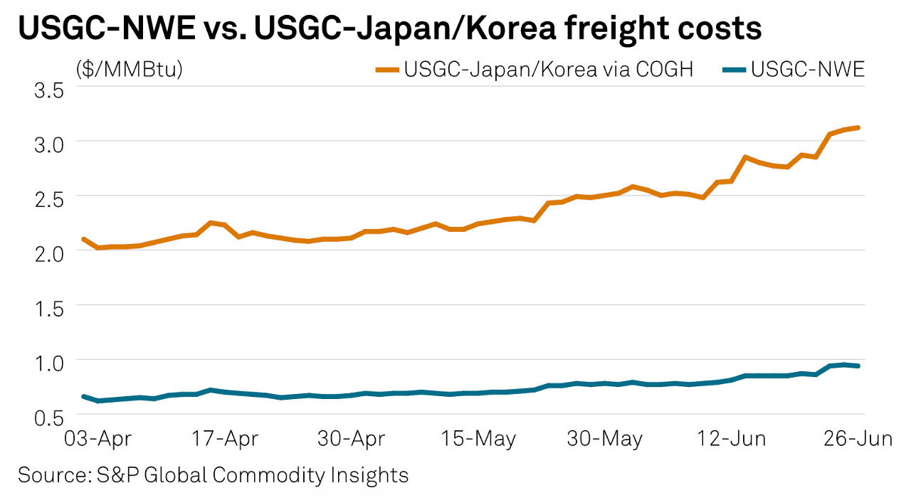 The arbitrage for LNG cargoes moving from the Atlantic basin to the Far East has opened up as market participants brace for the upcoming summer season, although rising freight rates pose a risk to the arbitrage opportunity. The spread between Europe and Asia's spot LNG prices in June has remained wide, which means that more US cargoes should head to the Far East, where the netbacks from the US Gulf Coast are stronger, further easing Asian supply.