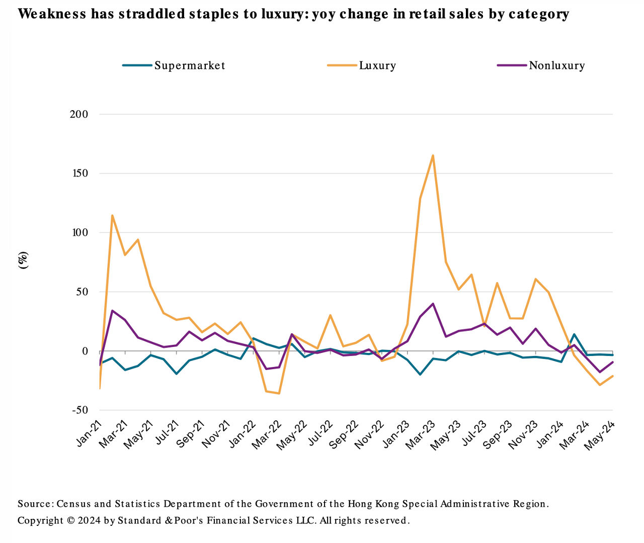 Difficult times call for difficult measures. Even as retail sales are falling in Hong Kong, the city's major landlords will spend more to attract footfall. S&P Global Ratings thinks the investments will be manageable for rated landlords and should pay off. Revamps are needed because the profile of shoppers is changing. Hong Kong is still not drawing the level of mainland Chinese visitors it did prior to the pandemic. Given the pie is not growing, major landlords need to attract footfall from rival shopping areas and online retail.