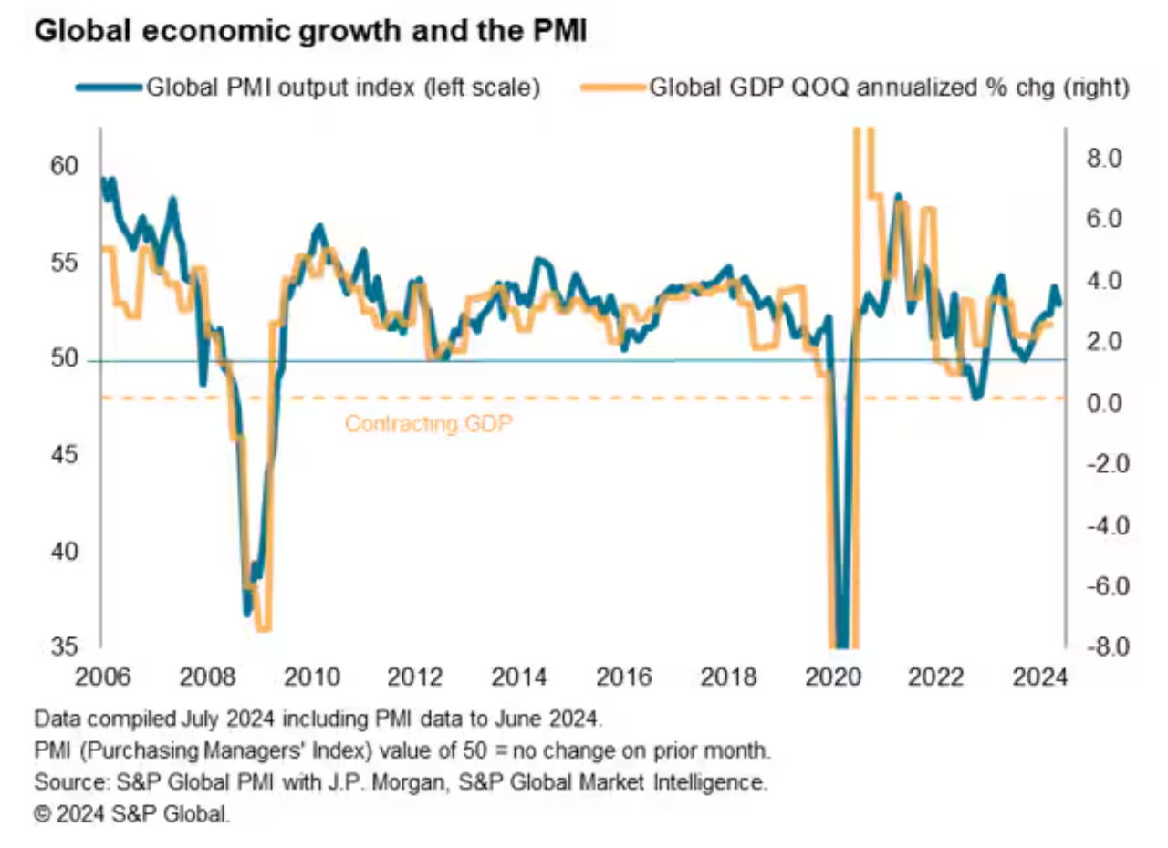 Global economic growth slowed in June but remained the second-strongest seen for just over a year, according to PMI data, pointing to a further robust expansion in the second quarter of 2024 after the slowdown seen in late 2023. June saw a further slight acceleration of growth in the US, bucking a broader developed world slowdown, while India continued to lead the emerging markets by a wide margin.