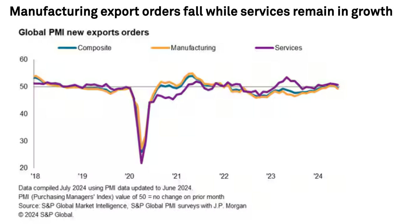 The worldwide Purchasing Managers' Index (PMI) surveys compiled by S&P Global Market Intelligence indicated that global trade deteriorated in June for the first time in three months, albeit only marginally. The seasonally adjusted Global PMI New Export Orders Index, sponsored by JPMorgan and compiled by S&P Global, posted 49.6 in June, down from 50.6 in May. Falling past the 50.0 no-change mark, the latest reading signalled the first deterioration in trade conditions since March.