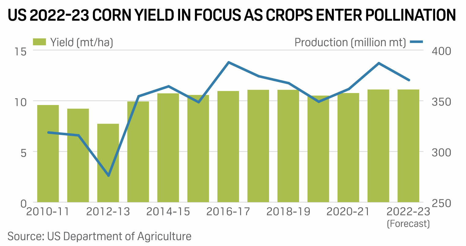 Weather conditions are likely to remain unfavorable for corn crops in the key producing states of the U.S. as they enter the crucial stage of pollination in the next few days, which could hurt yields, but any dramatic decline in yields is unlikely at this point, according to Kyle Tapley, senior agricultural meteorologist with Colorado-based private weather service Maxar.
