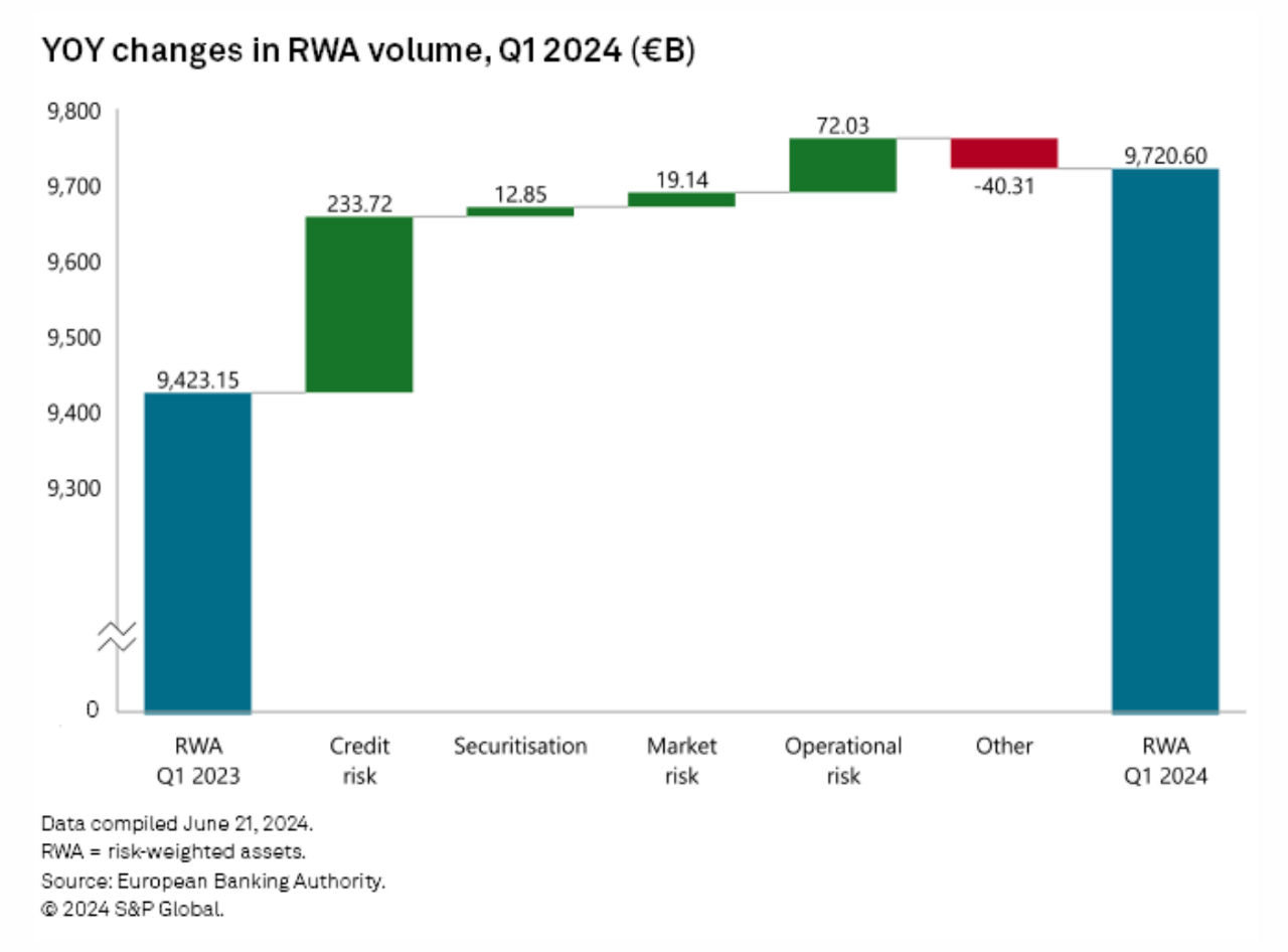 Credit and cybersecurity risks faced by European banks have increased over the past year as asset quality deterioration and digital security challenges ticked up. The volume of risk-weighted assets (RWA) of banks in the EU and the European Economic Area increased by more than 3% to €9.72 trillion at the end of March from €9.42 trillion a year before, according to the European Banking Authority's latest risk dashboard. Credit risk contributed €233.72 billion to the total RWA increase, while operational risks contributed €72.03 billion.