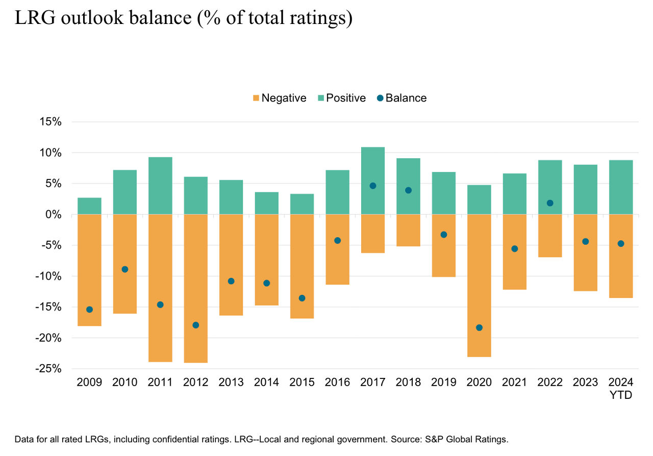 Credit quality for local and regional governments (LRGs) outside the US remains largely stable. A negative rating outlook bias persists and suggests ratings volatility over the next few years. Public-sector spending could accelerate, with different implications for budgets: In countries where national restrictions on regional deficits and debt levels are either loose or don’t exist, budgetary performance remains weak, leading to relatively fast debt accumulation — for example Australia, Belgium and Canada. In some European countries where regional governments must comply with national restrictions, spending pressure is transferred to lower tiers of government and public-sector enterprises.