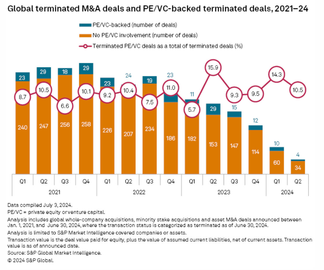 The number of terminated private equity-backed deals globally fell 86.2% year over year to just four in the second quarter, according to data from S&P Global Market Intelligence. The decrease in terminated deals suggests a stronger closing momentum in recent periods, as buyers and sellers bridge valuation gaps more effectively.