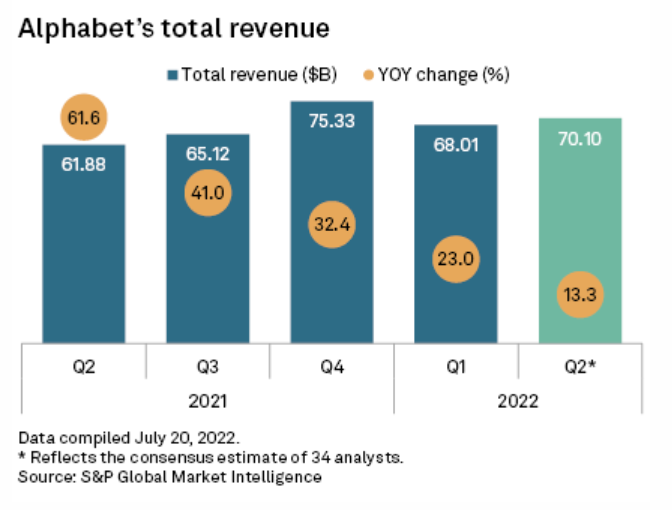 Alphabet Inc. is expected to report another quarter of slowing growth as macroeconomic headwinds and intensifying regulatory scrutiny weigh on its core advertising business. Fears regarding a potential recession are driving many companies to scale back ad budgets, directly impacting Alphabet's growth prospects. The Google LLC parent company faces headwinds from difficult comparisons to 2021 when its revenue growth skyrocketed partly due to a rebound off early pandemic lows.