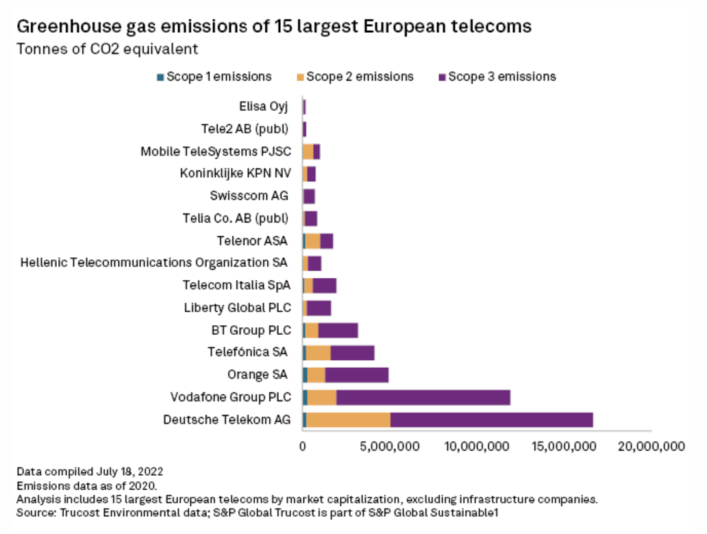 As the European telecom sector forges ahead on reducing its direct carbon emissions, cleaning up the supply chain remains a challenge. Scope 1 emissions, those emitted directly by a company's business, represent just 3.2% of the carbon footprint generated by the largest 15 telcos in Europe by market capitalization, according to data from S&P Global Market Intelligence. Scope 2, indirect emissions associated with the purchase of energy, represent about 24.6%.