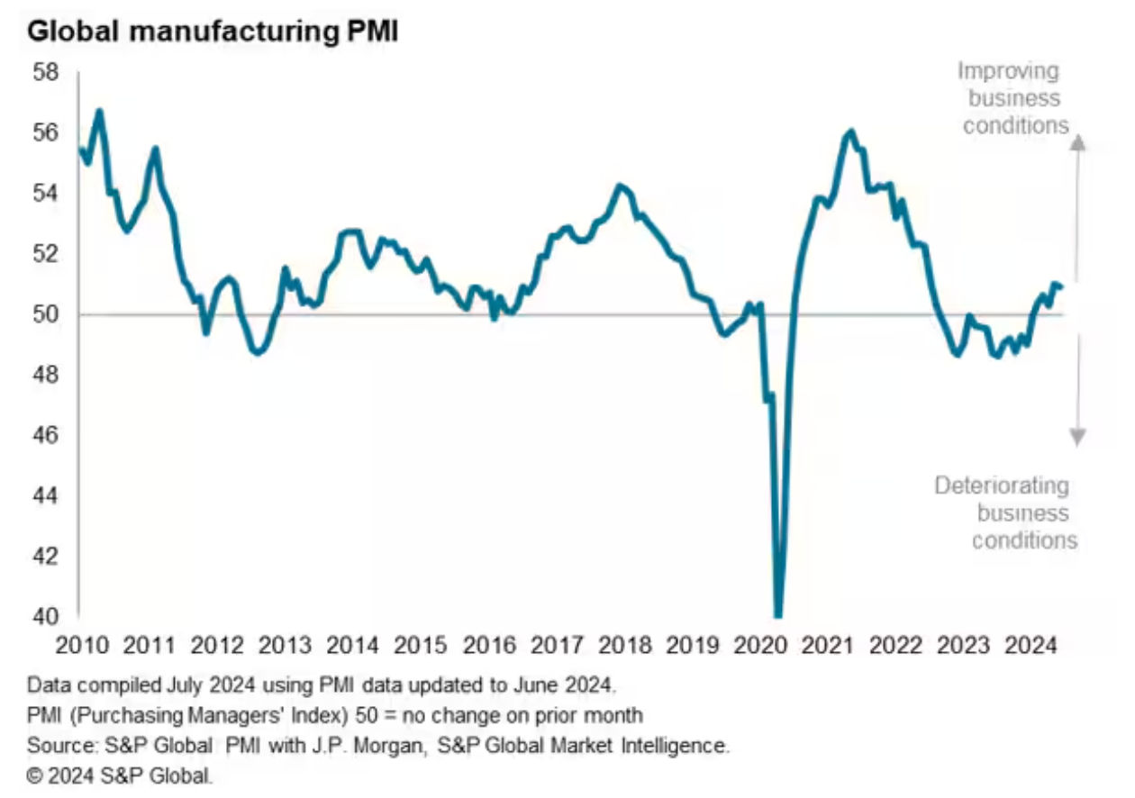 At 50.9 in June, the Global Manufacturing PMI, sponsored by J.P.Morgan and compiled by S&P Global Market Intelligence, recorded above 50.0 neutral mark (and therefore indicating improving business conditions) for a fifth successive month. Down from 51.0 in May, the latest data signalled a marginal easing in the rate of improvement, though nevertheless points to the second-strongest upturn seen over the past two years and represents a further recovery from the downturn in manufacturing which began in the latter half of 2022, through to 2023.