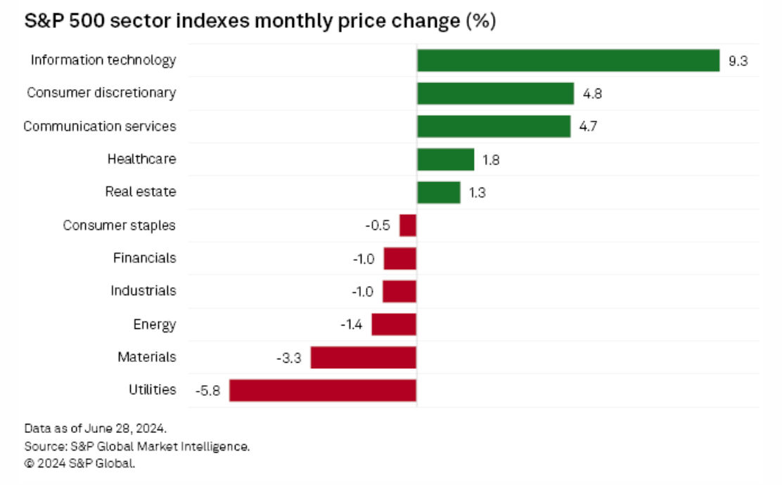 Large-cap stock indexes rose during June, extending the S&P 500's rally into a second straight month. The S&P 500 rose 3.5% during the month, while the Dow Jones Industrial Average gained 1.1%. Smaller-cap stocks, though, struggled as the Russell 2000 index shed 1.1% during the month. Technology stocks continued to drive the mega-cap S&P 500 higher as investors jump into artificial intelligence and related stocks.